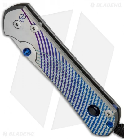 This Large Sebenza 21 features a satin finished titanium handle face with a Unique Graphic and a Blue Sapphire Cabochon. The frame lock and pocket clip are bead blast finished with a blue anodized finished thumb lug and spacer. This Sebenza has a satin finished S35VN stainless steel blade. Includes lanyard and leather pouch.