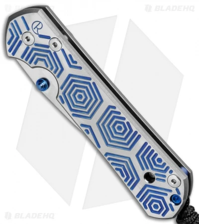 This Large Sebenza 21 features a Blue Hex computer generated graphic (CGG) handle design. The framelock and pocket clip are bead blast finished. It is outfitted with a light stonewashed S35VN stainless steel blade with a blue thumb lug. Includes lanyard and leather pouch.