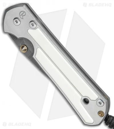This Large Sebenza 21 model features a Devin Thomas ladder Damascus blade with a gold thumb lug and a satin finished titanium handle with mammoth ivory inlays. The frame lock and pocket clip are bead blast finished titanium.
