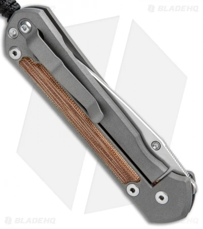 Bridging the gap between hi-tech titanium and the organic feel of natural material is the left-handed Sebenza 21, drop point blade. This knife features natural canvas micarta inlays, each piece fits exactly into one of three pockets machined into the handle—two on the front and one on the back. It’s outfitted with a stonewash drop point blade.