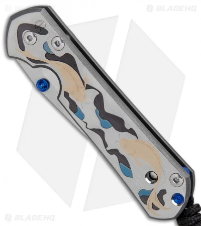 This Small Sebenza 21 features a satin finished titanium handle face with a Koi Pond computer generated graphic (CGG). The framelock and pocket clip are bead blast finished. It is outfitted with a stonewashed S35VN stainless steel blade with a blue thumb lug. Includes lanyard and leather pouch.