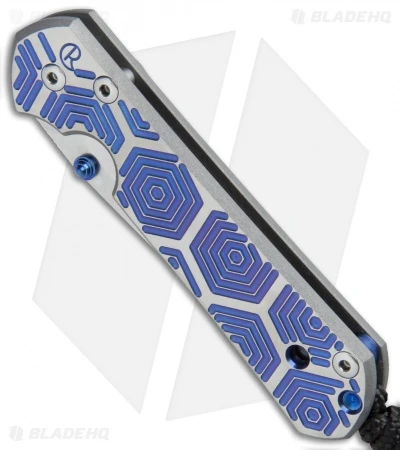 This Small Sebenza 21 features a satin finished titanium handle face with a “Blue Hex” computer generated graphic (CGG). The frame lock and pocket clip are bead blast finished. It is outfitted with a stonewashed S35VN stainless steel blade with a thumb lug. Includes lanyard and leather pouch.