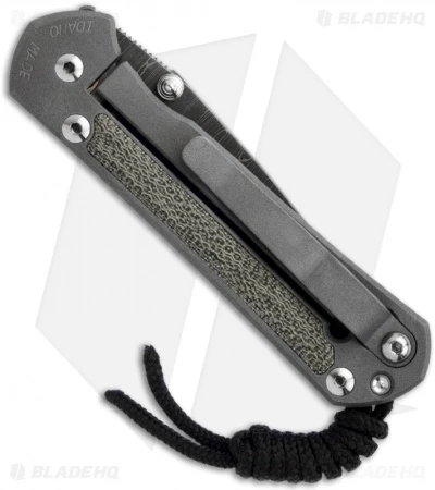 This Chris Reeve Small Sebenza 21 features a Devin Thomas stainless Ladder Damascus blade and a bead blasted titanium handle with black canvas Micarta inlays. The silver colored double thumb studs and spacer give it a nice accent. Includes lanyard and titanium pocket clip. Made in the USA.