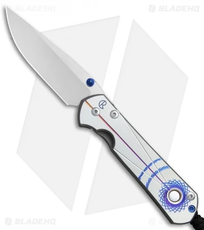 This Large Sebenza 21 features a satin finished titanium handle face with a Unique Graphic and a mother of pearl inlay. The framelock and pocket clip are bead blast finished. This Large Sebenza has blue thumb lug and spacer and a polished S35VN stainless steel blade. Item includes a lanyard and leather pouch.